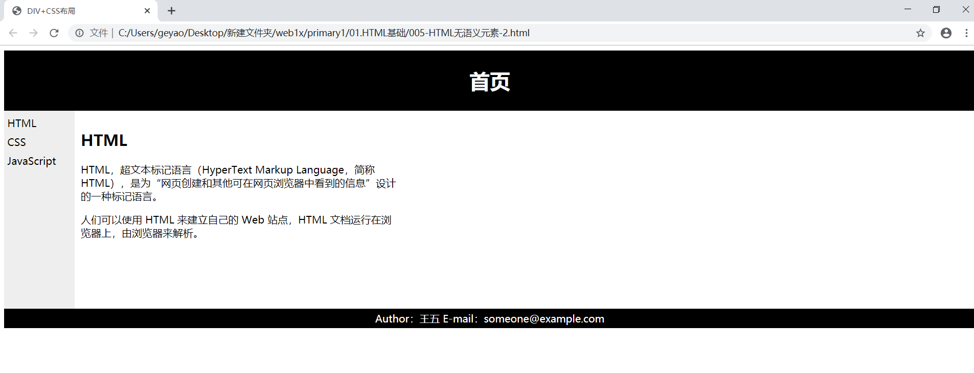 <html><head><meta http-equiv="content-type" content="text/html; charset=utf-8"><title>DIV+CSS布局</title><style>#header {background-color: black;color: white;text-align: center;padding: 5px;}#nav {line-height: 30px;background-color: #eeeeee;height: 300px;width: 100px;float: left;padding: 5px;}#section {width: 500px;float: left;padding: 10px;}#footer {background-color: black;color: white;clear: both;text-align: center;padding: 5px;}</style></head><body><div id="header"><h1>首页</h1></div><div id="nav">HTML<br>CSS<br>JavaScript<br></div><div id="section"><h2>HTML</h2><p>HTML,超文本标记语言(HyperText Markup Language,简称HTML),是为“网页创建和其他可在网页浏览器中看到的信息”设计的一种标记语言。</p><p>人们可以使用 HTML 来建立自己的 Web 站点,HTML 文档运行在浏览器上,由浏览器来解析。</p></div><div id="footer">Author:王五 E-mail:someone@example.com</div></body>