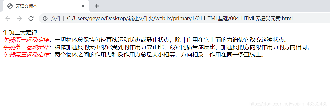 <html><head><meta http-equiv="content-type" content="text/html; charset=utf-8"><title>无语义标签</title><style type="text/css">.dfn{color: red;}</style></head><body><div>牛顿三大定律<div><span class="dfn"><dfn>牛顿第一运动定律</dfn></span>:一切物体总保持匀速直线运动状态或静止状态,除非作用在它上面的力迫使它改变这种状态。</div><div><span class="dfn"><dfn>牛顿第二运动定律</dfn></span>:物体加速度的大小跟它受到的作用力成正比、跟它的质量成反比,加速度的方向跟作用力的方向相同。</div><div><span class="dfn"><dfn>牛顿第三运动定律</dfn></span>:两个物体之间的作用力和反作用力总是大小相等,方向相反,作用在同一条直线上。</div></div></body>