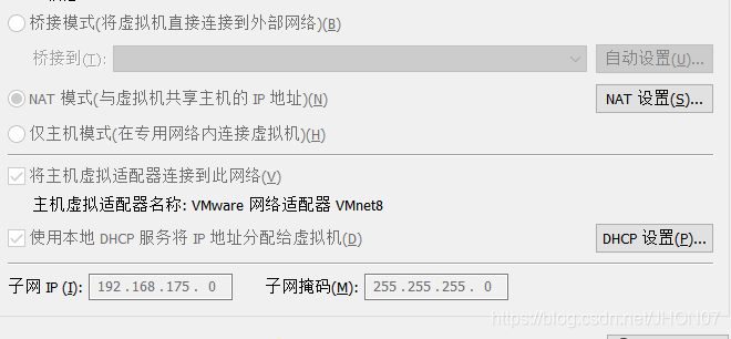 查了一下 vmnet8 自动分配的 ipv4 和虚拟机 分配的网关地址没有在一个网段:虚拟机是:192.168.175.X