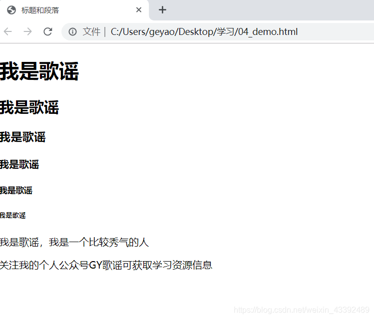 <body><h1>我是歌谣</h1><h2>我是歌谣</h2><h3>我是歌谣</h3><h4>我是歌谣</h4><h5>我是歌谣</h5><h6>我是歌谣</h6><p>我是歌谣,我是一个比较秀气的人</p><p>关注我的个人公众号GY歌谣可获取学习资源信息</p>