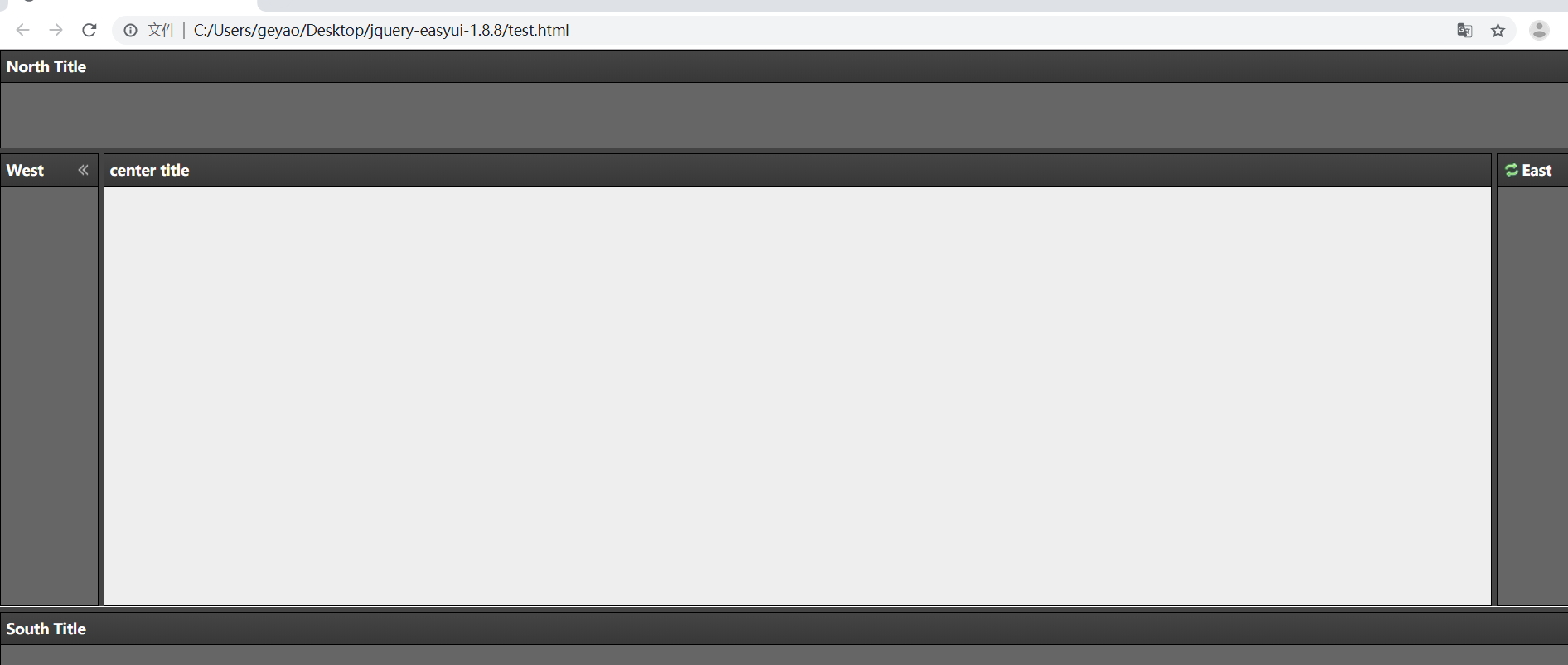 <head><meta charset="UTF-8"><title>Document</title><link href="themes/black/easyui.css" rel="stylesheet" /><link href="themes/icon.css" rel="stylesheet" /><script src="jquery.min.js"></script><script src="jquery.easyui.min.js"></script><script src="locale/easyui-lang-jp.js"></script><body class="easyui-layout"> <div data-options="region:'north',title:'North Title',split:true" style="height:100px;"></div><div data-options="region:'south',title:'South Title',split:true" style="height:100px;"></div><div data-options="region:'east',iconCls:'icon-reload',title:'East',split:true" style="width:100px;"></div><div data-options="region:'west',title:'West',split:true" style="width:100px;"></div> <div data-options="region:'center',title:'center title'" style="padding:5px;background:#eee;"></div></body ></html>