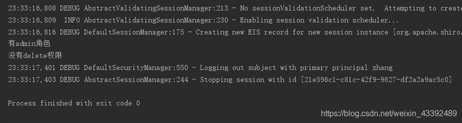 import org.apache.shiro.util.Factory;public class ShiroTest {public static void main(String[] args) {// 1、获取SecurityManager工厂,此处使用Ini配置文件初始化SecurityManagerFactory<SecurityManager> factory=new IniSecurityManagerFactory("classpath:shiro.ini");// 2、得到SecurityManager实例 并绑定给SecurityUtilsSecurityManager securityManager = factory.getInstance();SecurityUtils.setSecurityManager(securityManager);// 3、得到Subject及创建用户名/密码身份验证Token(即用户身份/凭证)Subject subject = SecurityUtils.getSubject();UsernamePasswordToken token = new UsernamePasswordToken("zhang", "123");//UsernamePasswordToken token2 = new UsernamePasswordToken("password", "wei");try {// 4、登录,即身份验证subject.login(token);if(subject.hasRole("admin")){System.out.println("有admin角色");}else{System.out.println("没有admin角色");}if(subject.isPermitted("del")){System.out.println("有delete权限");}else{System.out.println("没有delete权限");}//subject.login(token2);} catch (AuthenticationException e) {e.printStackTrace();System.out.println("登录失败 ");// 5、身份验证失败}// 6、退出subject.logout();}