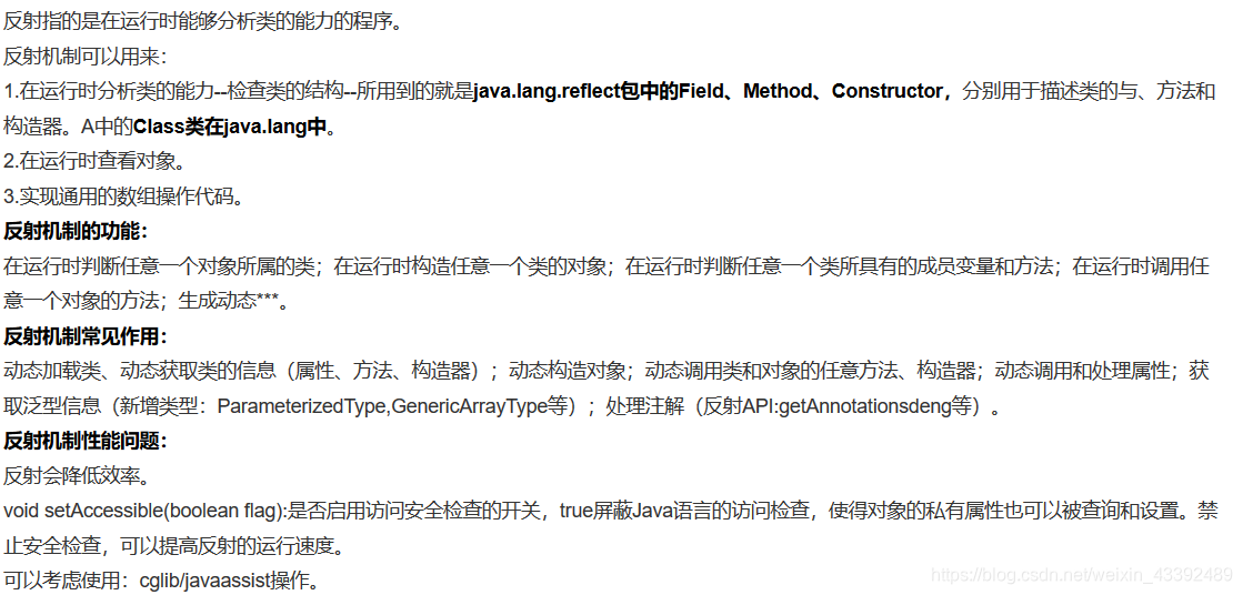 (2)反射调用方法时可以忽略权限检查,因此可能会破坏封装性而导致安全问题。
