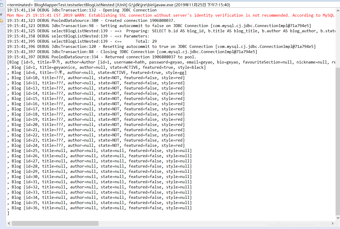 import com.geyao.mybatis.util.MyBatisUtil;public class BlogMapperTest {@Testpublic void testselectBlogListNested() {SqlSession session =MyBatisUtil.getSqlSession();BlogMapper blogMapper =session.getMapper(BlogMapper.class);List<Blog> biogList = blogMapper.selectBlogListNested();session.close();System.out.println(biogList);}}