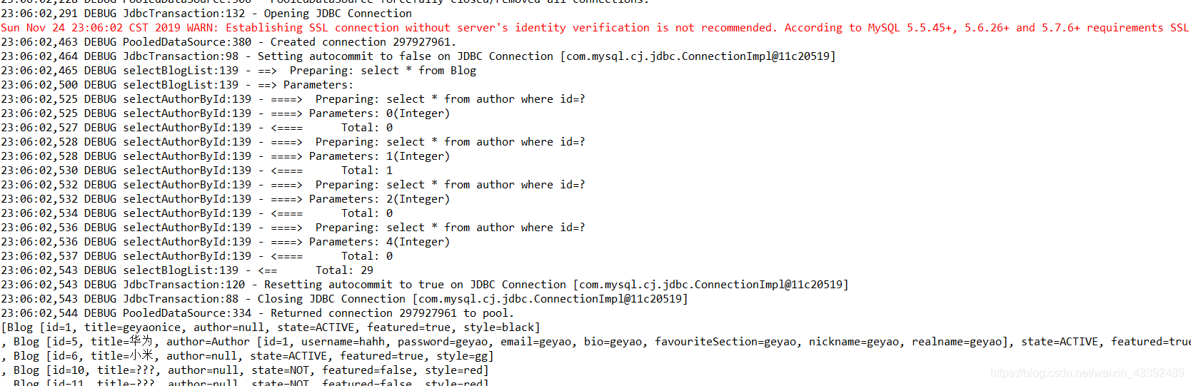 import com.geyao.mybatis.util.MyBatisUtil;public class BlogMapperTest {@Testpublic void testSelectBlog() {SqlSession session =MyBatisUtil.getSqlSession();BlogMapper blogMapper =session.getMapper(BlogMapper.class);Blog blog = blogMapper.selectBlogById(1);session.close();System.out.println(blog);}@Testpublic void testSelectBlogList() {SqlSession session =MyBatisUtil.getSqlSession();BlogMapper blogMapper =session.getMapper(BlogMapper.class);List<Blog> biogList = blogMapper.selectBlogList();session.close();System.out.println(biogList);}}