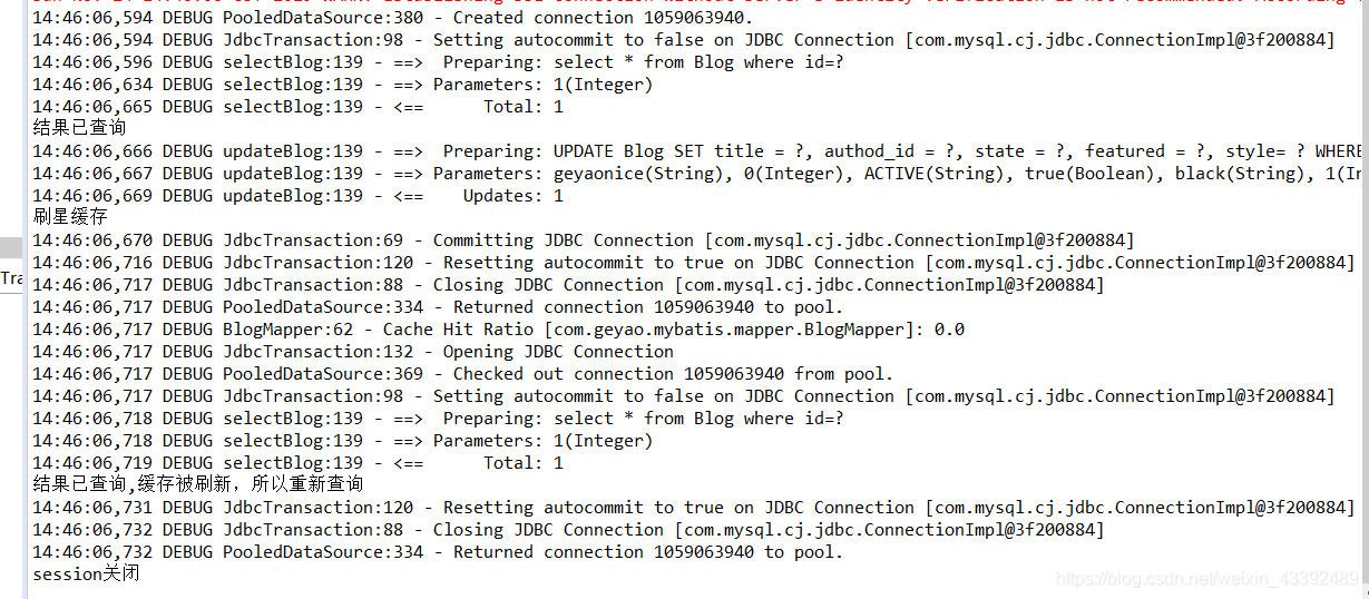 public void testSelectBlogCacheLevelOne2() {SqlSession session =MyBatisUtil.getSqlSession();BlogMapper blogMapper =session.getMapper(BlogMapper.class);Blog blog1=blogMapper.selectBlog(1);System.out.println("结果已查询");blog1.setFeatured(true);blogMapper.updateBlog(blog1);System.out.println("刷星缓存");Blog blog2=blogMapper.selectBlog(2);System.out.println("重新执行查询");session.close();System.out.println("session关闭");}