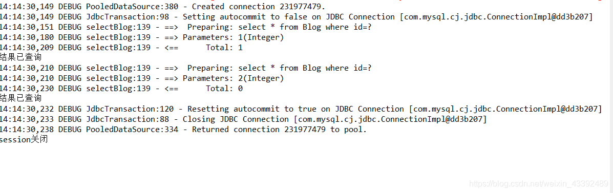 public void testSelectBlogCacheLevelOne1() {SqlSession session =MyBatisUtil.getSqlSession();BlogMapper blogMapper =session.getMapper(BlogMapper.class);Blog blog1=blogMapper.selectBlog(1);System.out.println("结果已查询");Blog blog2=blogMapper.selectBlog(2);System.out.println("结果已查询");session.close();System.out.println("session关闭");}