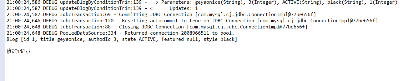 public void testupdateBlog() {SqlSession session =MyBatisUtil.getSqlSession();BlogMapper blogMapper =session.getMapper(BlogMapper.class);Blog blog=new Blog();blog.setId(1);blog.setTitle("geyao");blog.setStyle("balck");blog.setState("active");blog.setFeatured(false);blog.setAuthodId(2);int count= blogMapper.updateBlog(blog);session.commit();session.close();System.out.println(blog);System.out.println("修改"+count+"记录");