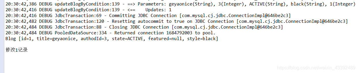 public void testupdateBlog() {SqlSession session =MyBatisUtil.getSqlSession();BlogMapper blogMapper =session.getMapper(BlogMapper.class);Blog blog=new Blog();blog.setId(1);blog.setTitle("geyao");blog.setStyle("balck");blog.setState("active");blog.setFeatured(false);blog.setAuthodId(2);int count= blogMapper.updateBlog(blog);session.commit();session.close();System.out.println(blog);System.out.println("修改"+count+"记录");