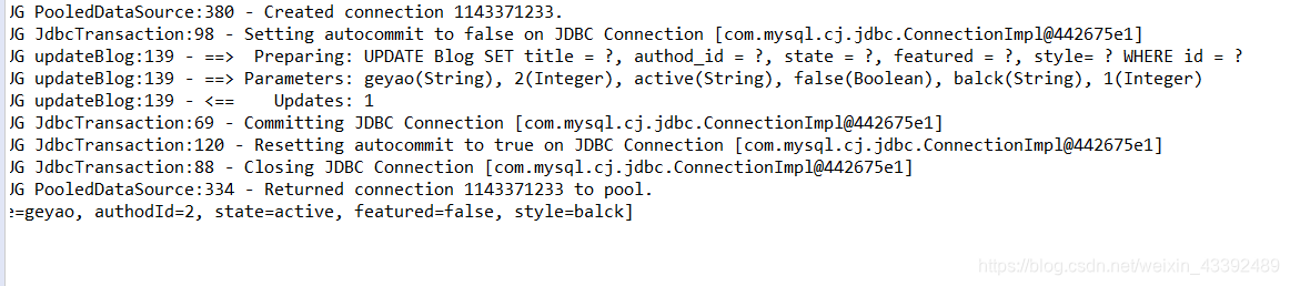 public void testupdateBlog() {SqlSession session =MyBatisUtil.getSqlSession();BlogMapper blogMapper =session.getMapper(BlogMapper.class);Blog blog=new Blog();blog.setId(1);blog.setTitle("geyao");blog.setStyle("balck");blog.setState("active");blog.setFeatured(false);blog.setAuthodId(2);int count= blogMapper.updateBlog(blog);session.commit();session.close();System.out.println(blog);System.out.println("修改"+count+"记录");