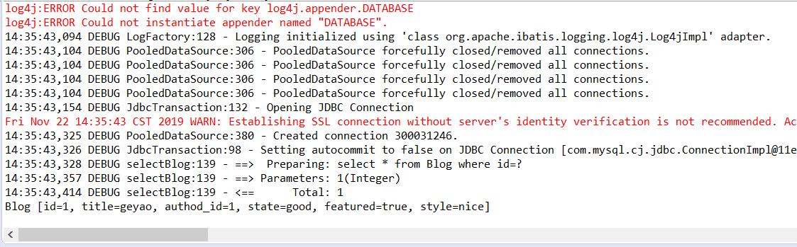 public void testSelectBlog() {SqlSession session =MyBatisUtil.getSqlSession();BlogMapper blogMapper =session.getMapper(BlogMapper.class);Blog blog = blogMapper.selectBlog("1");System.out.println(blog);