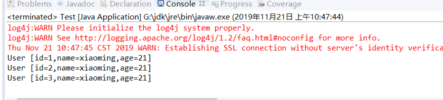 import org.apache.ibatis.session.SqlSessionFactoryBuilder;import com.edu.hpu.domain.User;public class Test {public static void main(String[] args) throws IOException {//mybatis的配置文件String resource = "conf.xml";//使用类加载器加载mybatis的配置文件(它也加载关联的映射文件)InputStream is = Test.class.getClassLoader().getResourceAsStream(resource);//构建sqlSession的工厂SqlSessionFactory sessionFactory = new SqlSessionFactoryBuilder().build(is);//使用MyBatis提供的Resources类加载mybatis的配置文件(它也加载关联的映射文件)//Reader reader = Resources.getResourceAsReader(resource); //构建sqlSession的工厂//SqlSessionFactory sessionFactory = new SqlSessionFactoryBuilder().build(reader);//创建能执行映射文件中sql的sqlSessionSqlSession session = sessionFactory.openSession();/*** 映射sql的标识字符串,* com.edu.hpu.mapping.userMapper是userMapper.xml文件中mapper标签的namespace属性的值,* getUser是select标签的id属性值,通过select标签的id属性值就可以找到要执行的SQL*/String statement = "com.edu.hpu.mapping.userMapper.getUser";//映射sql的标识字符串//执行查询返回一个唯一user对象的sqlfor(int i = 1;;i++){User user = session.selectOne(statement, i);if(user == null){break;}System.out.println(user);}}