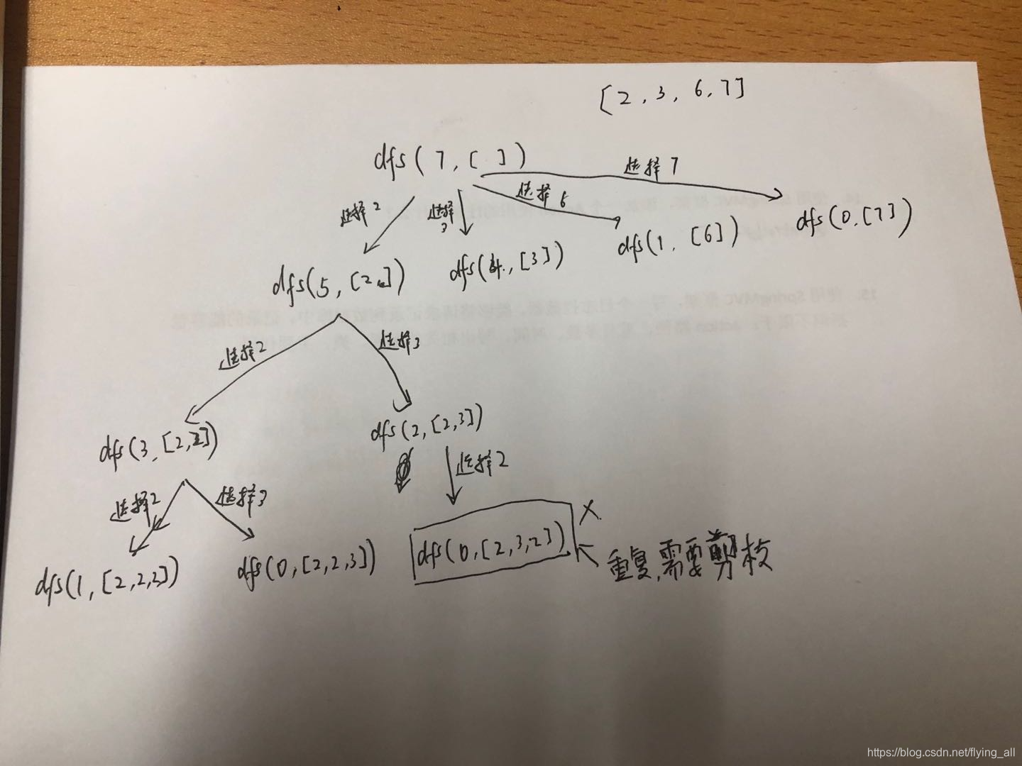 target=3,可以选择2,3。因为6,7大于3,不用选择剪枝。选择2,list添加2,进入target=1。