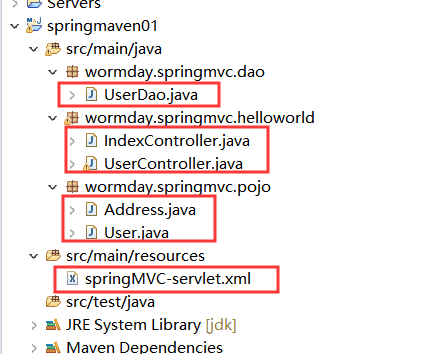 <beans xmlns="http://www.springframework.org/schema/beans"xmlns:xsi="http://www.w3.org/2001/XMLSchema-instance"xmlns:context="http://www.springframework.org/schema/context"xmlns:mvc="http://www.springframework.org/schema/mvc"xsi:schemaLocation="http://www.springframework.org/schema/beans http://www.springframework.org/schema/beans/spring-beans.xsdhttp://www.springframework.org/schema/context http://www.springframework.org/schema/context/spring-context-4.1.xsdhttp://www.springframework.org/schema/mvc http://www.springframework.org/schema/mvc/spring-mvc-4.1.xsd"><!-- 定义要扫描 controller的包--><context:component-scan base-package="wormday.springmvc.helloworld" /><!-- 定义要扫描 controller的包--><context:component-scan base-package="wormday.springmvc.dao" /><!-- 配置视图解析器 如何把handler 方法返回值解析为实际的物理视图 --><!--指定视图解析器--><bean class="org.springframework.web.servlet.view.InternalResourceViewResolver"><!-- 视图的路径 --><property name="prefix" value="/WEB-INF/jsp/"/><!-- 视图名称后缀  --><property name="suffix" value=".jsp"/></bean></beans>