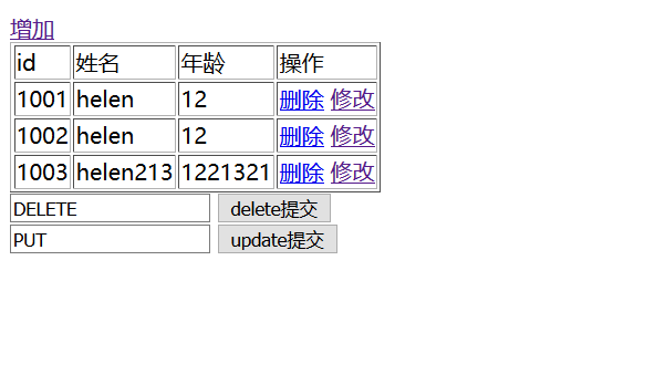 private UserDao userDao;@RequestMapping(value="/users",method=RequestMethod.GET)public String list(Model model) {Collection<User> userList=userDao.getAll();model.addAttribute("userList",userList);return "user/list";}@RequestMapping(value="/user/{id}",method=RequestMethod.DELETE)public String delete(@PathVariable(value="id")Integer id) {//执行删除System.out.println("delete"+id);userDao.delete(id);return "redirect:/users";}@RequestMapping(value="/user",method=RequestMethod.GET)public String add() {//执行删除System.out.println("add");return "user/add";}@RequestMapping(value="/user",method=RequestMethod.POST)public String save(User user) {//执行保存System.out.println("save");System.out.print(user);return "redirect:/users";}//编辑@RequestMapping(value="/user/{id}",method=RequestMethod.GET)public String edit(@PathVariable(value="id")Integer id,Model model) {//执行更新System.out.println("edit");User user=userDao.get(id);model.addAttribute("user", user);return "user/edit";}@RequestMapping(value="/user/{id}",method=RequestMethod.PUT)public String update(@PathVariable(value="id")Integer id,User user) {System.out.println("update");user.setId(id);userDao.save(user);return "redirect:/users";}}