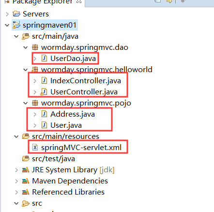 <beans xmlns="http://www.springframework.org/schema/beans"xmlns:xsi="http://www.w3.org/2001/XMLSchema-instance"xmlns:context="http://www.springframework.org/schema/context"xmlns:mvc="http://www.springframework.org/schema/mvc"xsi:schemaLocation="http://www.springframework.org/schema/beans http://www.springframework.org/schema/beans/spring-beans.xsdhttp://www.springframework.org/schema/context http://www.springframework.org/schema/context/spring-context-4.1.xsdhttp://www.springframework.org/schema/mvc http://www.springframework.org/schema/mvc/spring-mvc-4.1.xsd"><!-- 定义要扫描 controller的包--><context:component-scan base-package="wormday.springmvc.helloworld" /><!-- 定义要扫描 controller的包--><context:component-scan base-package="wormday.springmvc.dao" /><!-- 配置视图解析器 如何把handler 方法返回值解析为实际的物理视图 --><!--指定视图解析器--><bean class="org.springframework.web.servlet.view.InternalResourceViewResolver"><!-- 视图的路径 --><property name="prefix" value="/WEB-INF/jsp/"/><!-- 视图名称后缀 --><property name="suffix" value=".jsp"/></bean></beans>