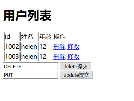 private UserDao userDao;@RequestMapping("/form")public String form() {return "form";}@RequestMapping("/save")public String save(User user) {System.out.print(user);return "success";}@RequestMapping("/edit")public ModelAndView edit(HttpSession session) {User user = new User();user.setUsername("helen");user.setPassword("123");user.setAge(12);user.setEmail("11@qq.com");Address address = new Address();address.setProvince("anhui");address.setCity("haha");user.setAddress(address);ModelAndView mv = new ModelAndView();mv.setViewName("form");mv.addObject("user", user);return mv;}@RequestMapping("/edit1")public String edit1(Map<String,Object> map) {User user = new User();user.setUsername("helen111");user.setPassword("123");user.setAge(12);user.setEmail("11@qq.com");Address address = new Address();address.setProvince("jiangsu");address.setCity("hah");user.setAddress(address);map.put("user",user);return "form";}@RequestMapping("/edit2")public String edit2(Model model) {User user = new User();user.setUsername("helen111");user.setPassword("123");user.setAge(12);user.setEmail("11@qq.com");Address address = new Address();address.setProvince("jiangsu");address.setCity("hah");user.setAddress(address);model.addAttribute("user",user);model.addAttribute("strvalue","gp1701");model.addAttribute("intvalue",1701);return "form";}@RequestMapping(value="/list",method=RequestMethod.GET)public String list(Model model) {Collection<User> userList=userDao.getAll();model.addAttribute("userList",userList);return "user/list";}@RequestMapping(value="delete")public String delete(Integer id) {//执行删除System.out.println("delete"+id);userDao.delete(id);return "redirect:/user/list";}@RequestMapping(value="/{id}",method=RequestMethod.PUT)public String update() {//执行更新System.out.println("update");return "redirect:/user/list";}