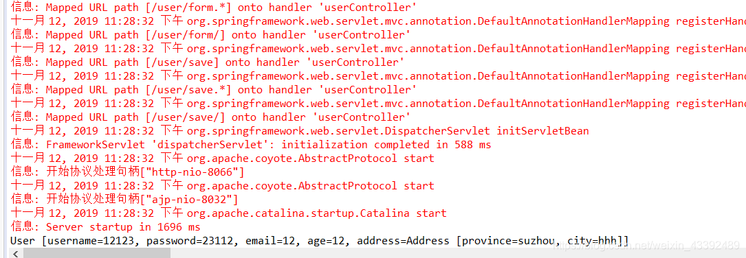 public class UserController {@RequestMapping("/form")public String form() {return "form";}@RequestMapping("/save")public String save(User user) {System.out.print(user);return "success";}
