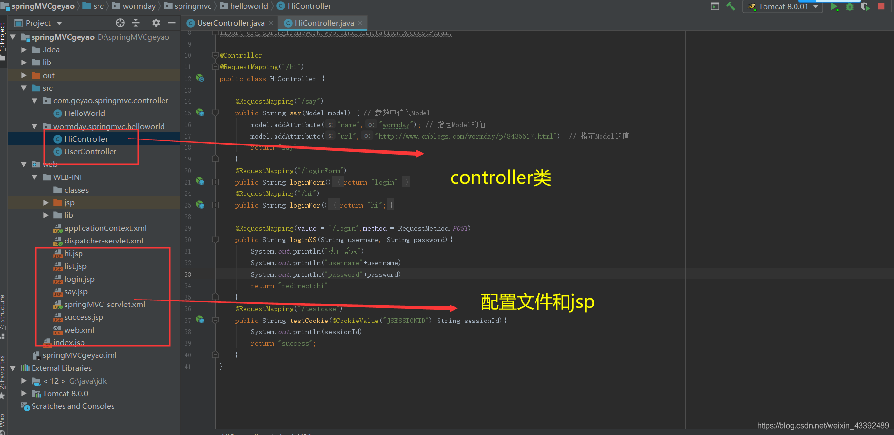 public class HiController {@RequestMapping("/say")public String say(Model model) { // 参数中传入Modelmodel.addAttribute("name","wormday"); // 指定Model的值model.addAttribute("url","http://www.cnblogs.com/wormday/p/8435617.html"); // 指定Model的值return "say";}@RequestMapping("/loginForm")public String loginForm(){return "login";}@RequestMapping("/hi")public String loginFor(){return "hi";}@RequestMapping(value = "/login",method = RequestMethod.POST)public String loginXS(String username, String password){System.out.println("执行登录");System.out.println("username"+username);System.out.println("password"+password);return "redirect:hi";}@RequestMapping("/testcase")public String testCookie(@CookieValue("JSESSIONID") String sessionId){System.out.println(sessionId);return "success";}@RequestMapping("/testHeader")public String testHeader(@RequestHeader(value = "User-Agent") String header){System.out.println(header);return "success";}