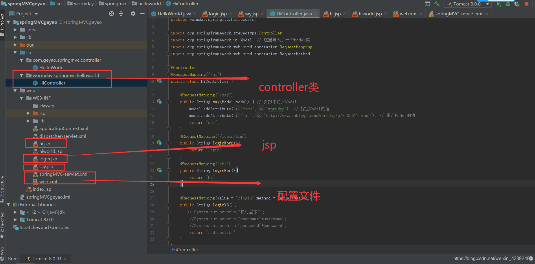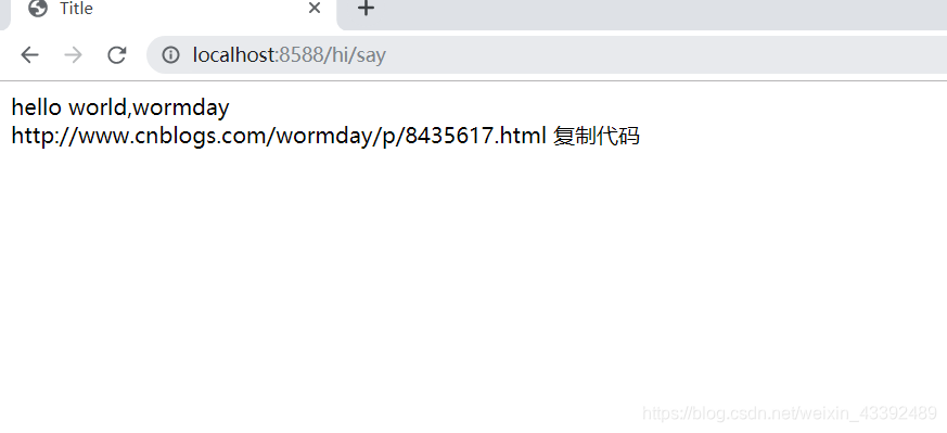 public class HiController {@RequestMapping("/say")public String say(Model model) { // 参数中传入Modelmodel.addAttribute("name","wormday"); // 指定Model的值model.addAttribute("url","http://www.cnblogs.com/wormday/p/8435617.html"); // 指定Model的值return "say";}@RequestMapping("/loginForm")public String loginForm(){return "login";}@RequestMapping("/hi")public String loginFor(){return "hi";}@RequestMapping(value = "/login",method = RequestMethod.POST)public String loginXS(){// System.out.println("执行登录");//System.out.println("username"+username);//System.out.println("password"+password);return "redirect:hi";}