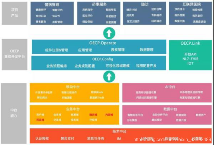 同时,中台之上我们要构建能快速落地的技术平台(如图中 OECP 部分),通过 Low code 的平台能力,实现组件的组装和流程的设计,快速的构建应用。