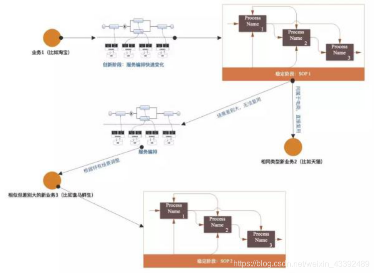 从中台的复用范围来看,我特别认同这种方式,因为中台只有提供 SOP,才是真正的实现业务流程这种高阶的复用(就像国外 ERP 宣扬的那样,你购买的不只是一套系统,还有企业管理到优秀实践)。