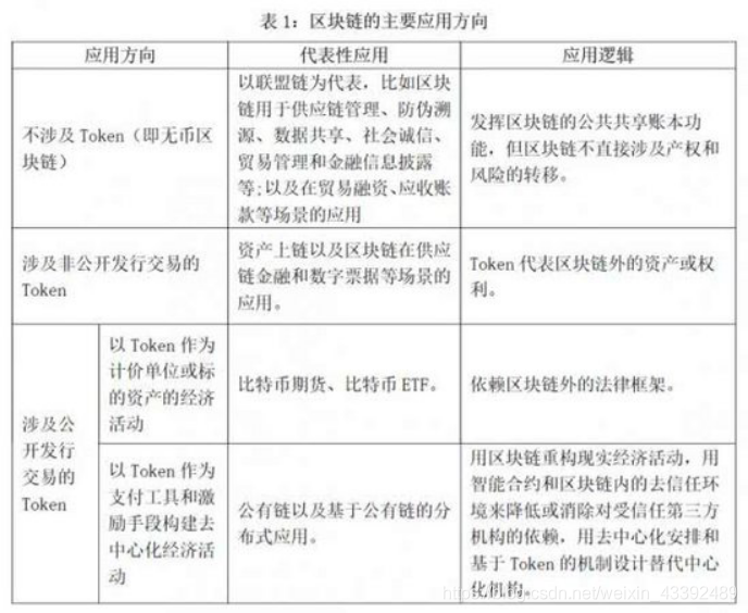 - 无币区块链。这类应用发挥区块链的公共共享账本功能以提高劳动分工协作效率,不直接涉及产权和风险的转移,面临的主要问题是如何保证区块链外信息在源头和写入区块链环节的真实准确性。联盟链因为仅对授权节点开放并依靠现实世界的约束,比公有链更适合这类应用。