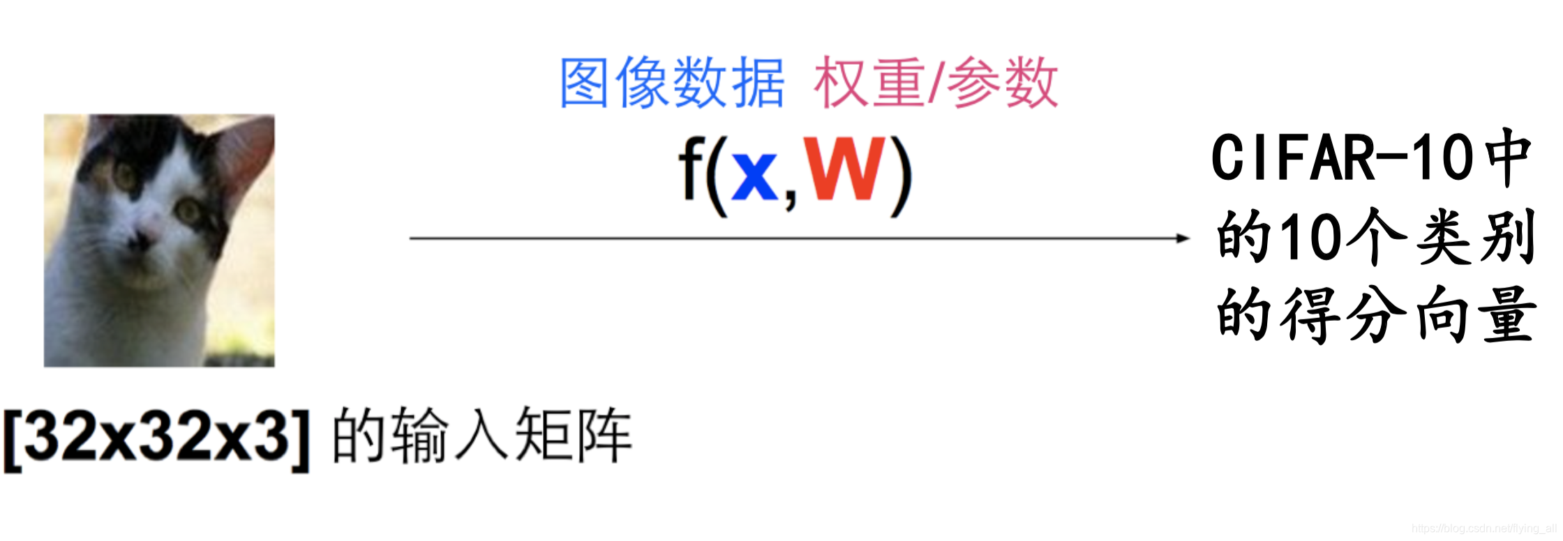 输入是一个32x32x3的图片,W是一个10x3072的矩阵,x是一个3072x1的向量),其中W叫做参数或者权重。f称为得分函数。