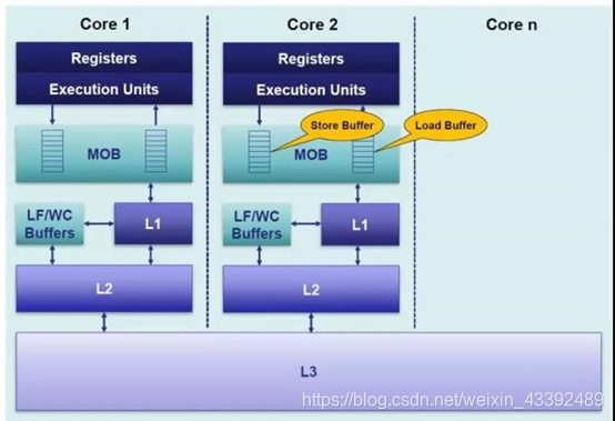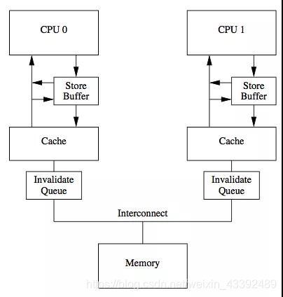 传统的MESI协议中有两个行为的执行成本比较大。一个是将某个Cache Line标记为Invalid状态,另一个是当某Cache Line当前状态为Invalid时写入新的数据。所以CPU通过Store Buffer和Invalidate Queue组件来降低这类操作的延时。如图: