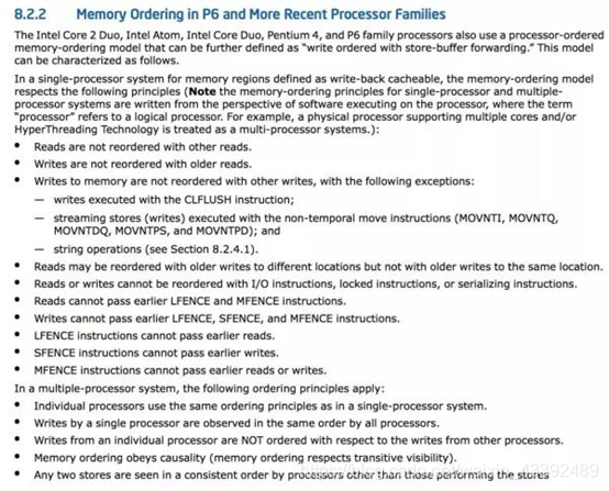 另外, 除了显式的内存屏障指令,有些指令也会造成指令保序的效果,比如I/O操作的指令、exch等原子交换的指令,任何带有lock前缀的指令以及CPUID等指令都有内存屏障的作用。
