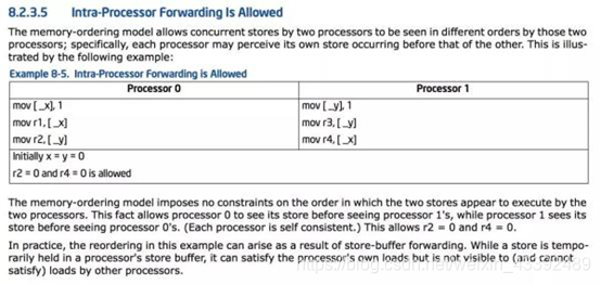 但是内存一致性模型不仅仅是没有指令重排就会保证一致的。但是如果仅仅只考虑指令重排,完全按照该规则来思考,就会遇到违反直觉的事情。特别的,在对写缓存的同步处理上,AMD64内存访问模型的 Intra-Processor Forwarding Is Allowed这个特性比较要命: