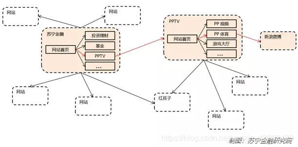同时,这些网页往往又链接了很多外部网站。例如,用户从苏宁金融的网页为起点,浏览发现了 PP 视频的链接,点击后跳转到了 PP 视频主页,作为体育爱好者,在体育频道中找到了相关的新浪微博的内容,再次点击后又来到微博的页面继续阅读,从而形成了一条路径。