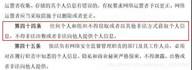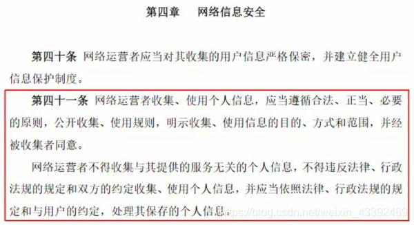 其实,我国 2017 年 6 月 1 日施行的《中华人民共和国网络安全法》第四章第四十一条和四十四条就已经对个人隐私信息数据的收集和使用做出明文规定,这也与爬虫直接相关。