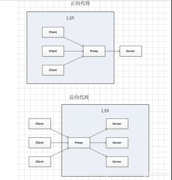 - 在反向代理中,Proxy 和 Server 同属于一个 LAN(图中方框内),隐藏了服务端信息。