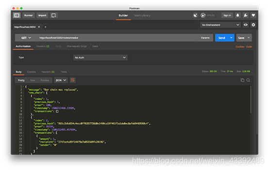 然后,我在节点2上挖到了一些新区块,以确保链更长。之后,对GET /nodes/resolve在节点1上进行了调用,在该节点上,该链被共识算法替换:
