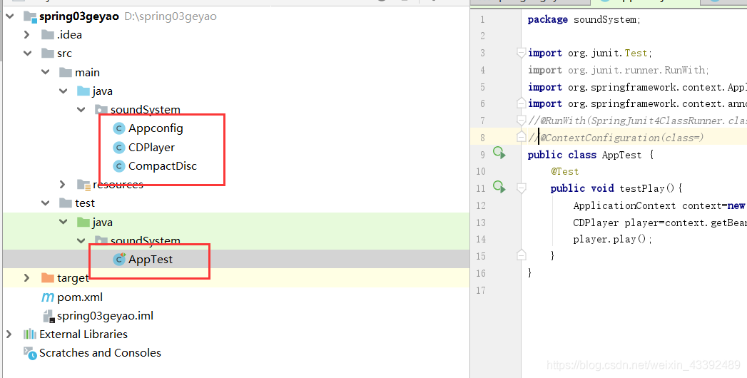 public class AppTest {@Testpublic void testPlay(){ApplicationContext context=new AnnotationConfigApplicationContext(Appconfig.class);CDPlayer player=context.getBean(CDPlayer.class);player.play();}