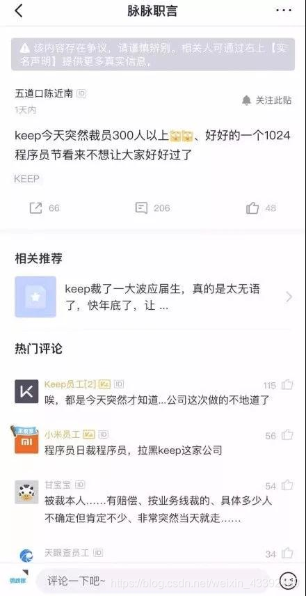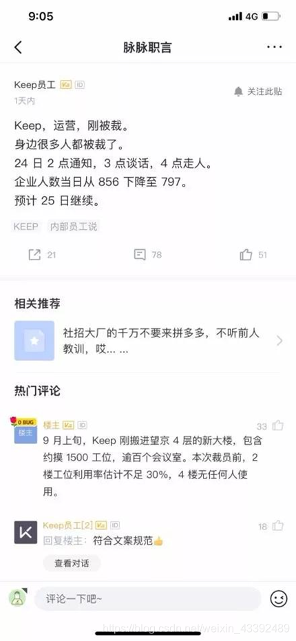 此外,在职场社交平台脉脉中,目前也有部分 Keep 认证员工发帖表示 Keep 正处于裁员期,被裁员工中还包括“一大波应届生”。
