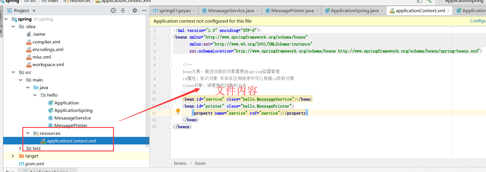 <beans xmlns="http://www.springframework.org/schema/beans"xmlns:xsi="http://www.w3.org/2001/XMLSchema-instance"xsi:schemaLocation="http://www.springframework.org/schema/beans http://www.springframework.org/schema/beans/spring-beans.xsd"><!--bean元素:描述当前的对象需要由spring容器管理id属性:标识对象 未来在应用程序中可以根据id获取对象class对象:被管理的对象的全名--><bean id="service" class="hello.MesasageService"></bean><bean id="printer" class="hello.MessagePrinter"><property name="service" ref="service"></property></bean>