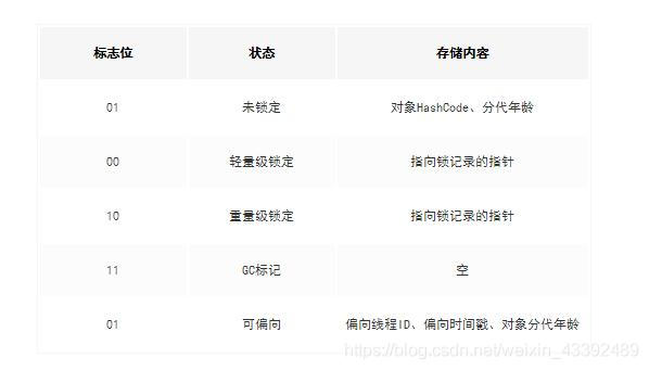 Mark Word是一个非固定的数据结构以便在极小的空间内存储尽量多的信息,它会根据对象的状态复用自己的存储空间。各状态下的存储内容如下表所示: