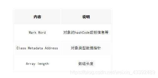 - 对象头又有两部分的信息,第一部分是用于存储对象自身的运行数据(HashCode、GC分代年龄、锁状态标志等)。另一部分是类型指针,指向它的类元数据,虚拟机通过这个指针确定这个对象是哪个类的实例(如果使用句柄池方式则不会有)。如果是数组还会有一个记录数组长度的如下表所示: