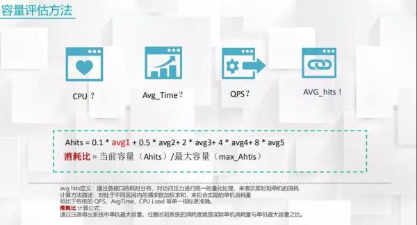 我们接入了另外一个概念叫消耗比,在耗时最大区间的 Ahits(请求数量)数(PPT 上显示:慢速比=100.0*当前容量(Ahits)/最大容量(max_Ahts))与总的请求数之比超过一定的比例,则是影响用户的体现。
