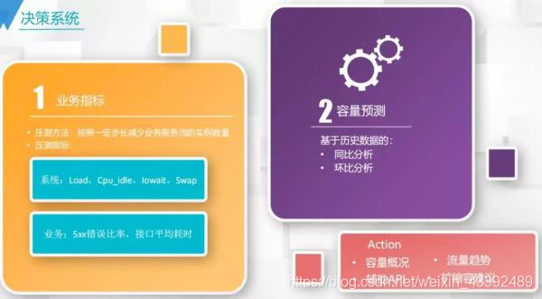 比如系统的基础信息、一些业务上日志来源的信息等,得到当前业务的容量,通过对历史数据进行同比、环比的分析,得到流量趋势,了解接下来流量会变成什么样子,这两组数据计算结果会给出扩缩容的建议。