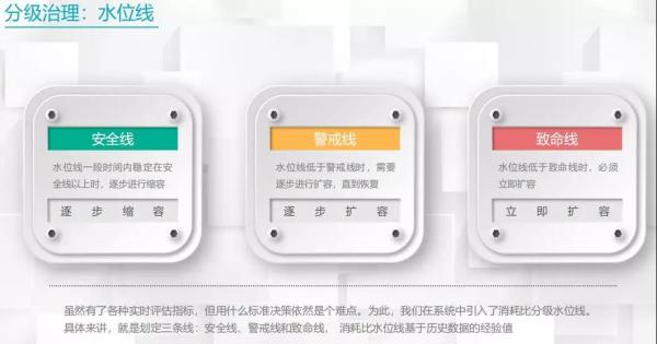 我们基于历史数据给予分析,制定了三条水位线,包括安全线、警戒线和致命线,拿当前消耗值与水位线进行对比,在不同阶段采取不同的措施。
