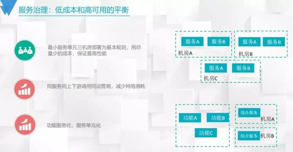 在保证服务稳定的情况下,将流量进行均分,分到最小服务单元三机房部署为基本规则,保障在一个机房挂掉的情况下,另外 2/3 的服务器能承载全部的流量。