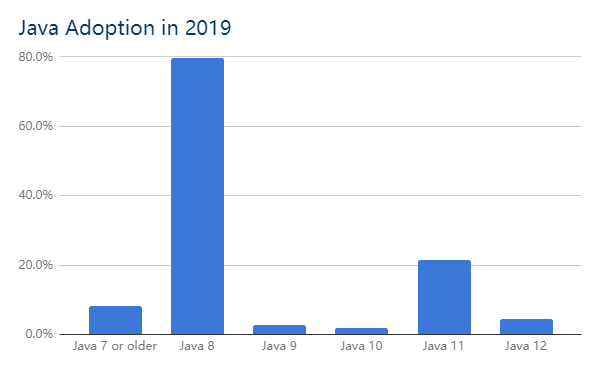 Java13 在前段时间也正式发布了,这份调查是在 Java13 发布之前,所以 Java13 不在统计范围之内。从这份统计中可以看出 Java 8 的使用者有高达 80%。这跟我们国内情况是差不多的,大部分公司都在使用 Java8 做开发,这个结果一点都不意外,Java8 的新特性确实能给开发者带来不少的便利之处,而且很多开源组件都要求使用 Java8。