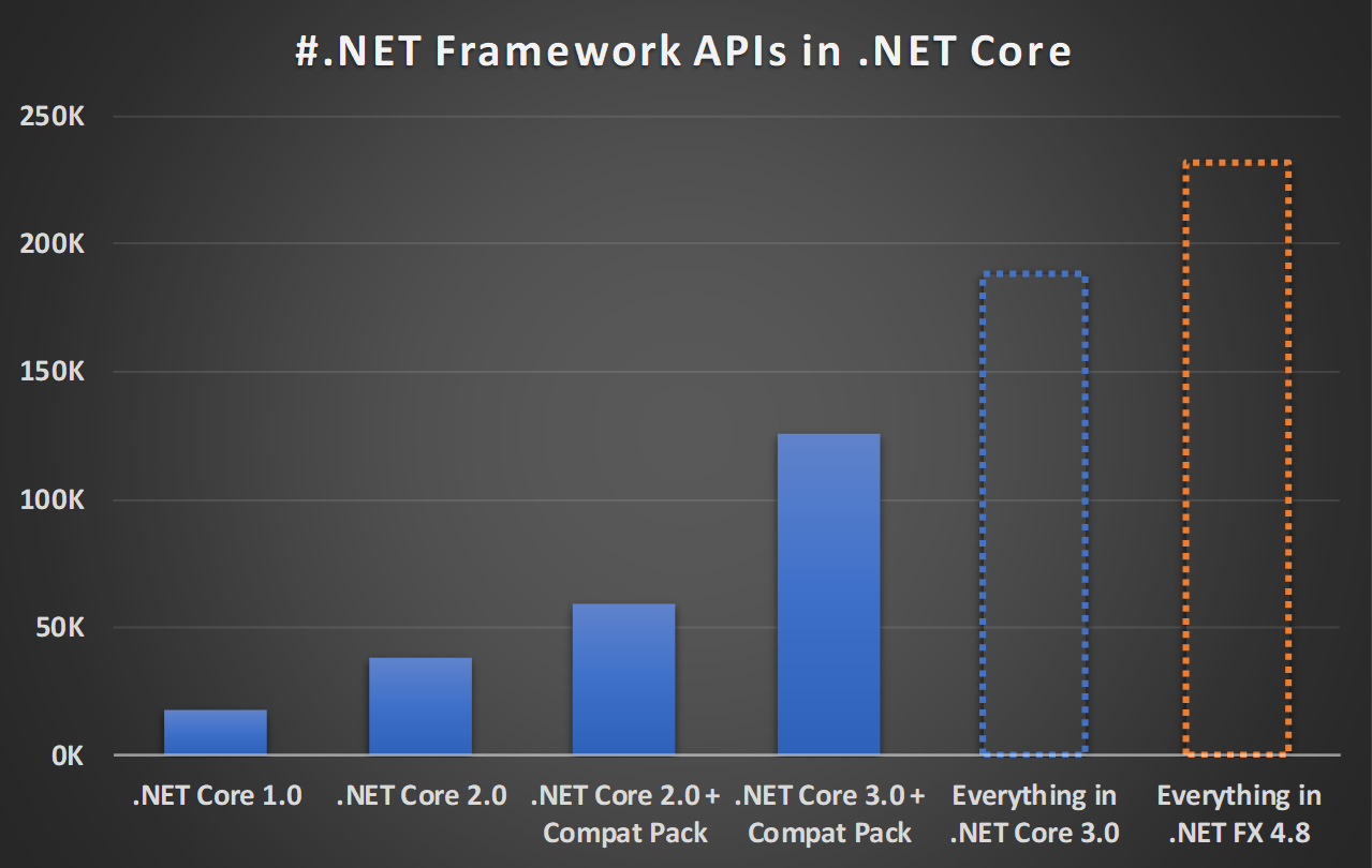 从 .NET Core 1.0 开始,它只有一个非常小的 API 集合,其中仅包含大约 1.8 万个 .NET Framework API。通过 .NET Standard 2.0,微软试图在 .NET Framework, .NET Core 和 Xamarin 之间共享代码,因此 .NET Core 2.0 提供了大约 3.8 万个 .NET Frameworks API。此外,微软还构建了兼容性套件包 —— Windows Compatibility Pack,而该套件包又让 .NET Core 增加了大约 2.1 万个 .NET Framework API。至此,前后大约有 6 万个 API 移植到了 .NET Core。