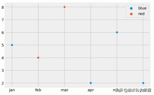 - weight = [5,4,8,2,6,2] month = [‘febrero’,’enero’,’abril’,’junio’,’marzo’,’mayo’] animal_type = [‘dog’,’cat’,’cat’,’dog’,’dog’,’dog’] hue = [‘blue’,’red’,’red’,’blue’,’blue’,’blue’] sns.scatterplot(x=month, y=weight, hue=hue);