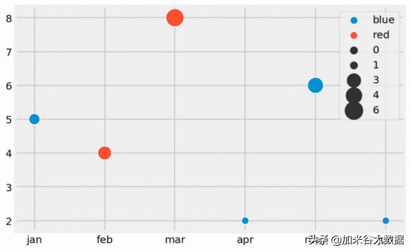 使用上面的相同示例,我们还可以使用从 1 到 5 的刻度表示图表中动物的大小。将此额外指标添加到绘图中的一个好选择是修改散点图的大小,通过「size」参数将大小指定给新的附加向量,并使用「size」调整它们之间的关系: