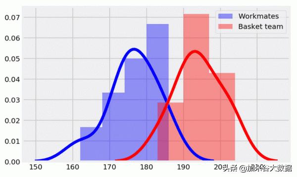 例如,假设你希望在同一个图形中重叠你采集的两个不同样本的身高分布:一个来自你的同事,另一个来自当地的篮球队。最好添加一些个性化的东西,如不同的颜色,并添加一个图例,表明它们具体代表的是哪一个。好吧,简单点: