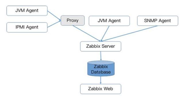 Zabbix核心组件主要是Agent和Server,其中Agent主要负责采集数据并通过主动或者被动的方式采集数据发送到Server/Proxy,除此之外,为了扩展监控项,Agent还支持执行自定义脚本。Server主要负责接收Agent发送的监控信息,并进行汇总存储,触发告警等。